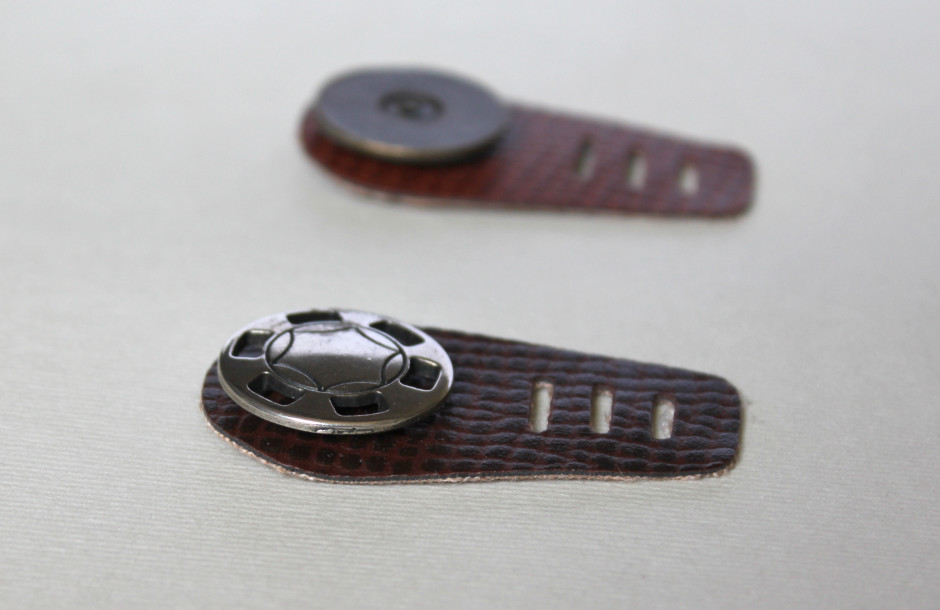 Snap buttons applied on a small sliced leather, to give it a more technical design.